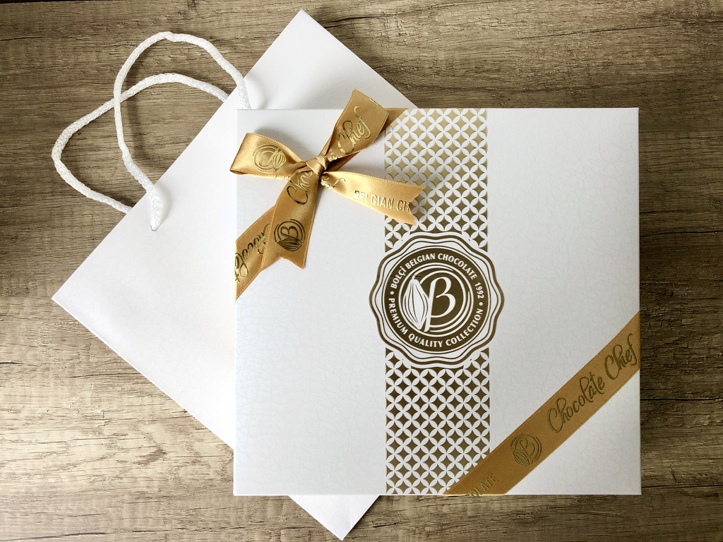 Čokoládové pralinky z kvalitní belgické čokolády v elegantním bílem boxu s tématickou dárkovou taškou.