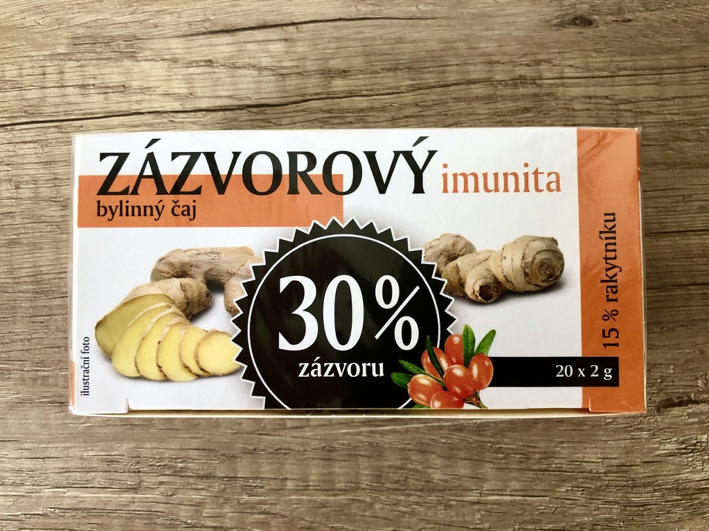 Bylinný čaj se zázvorem a rakytníkem, aromatizovaný.