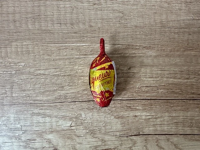 Šiška pro dospělé z mléčné čokolády plněná alkoholovou náplní s příchutí karamelu.